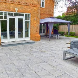Large patio with sheltered seating area complete with outdoor hanging wood burner -